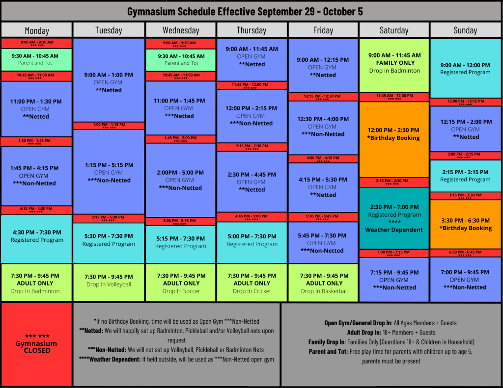 During registered programing, there will be no open gym and the gymnasium is closed. Open gym will resume per the current scheduleOc