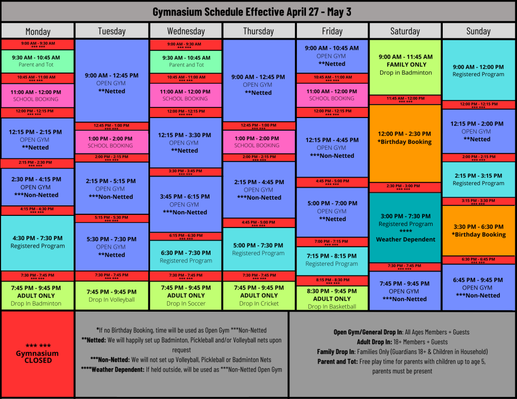 During registered programming, there will be no Open Gym and the gymnasium is closed. Open Gym will resume per the current schedule